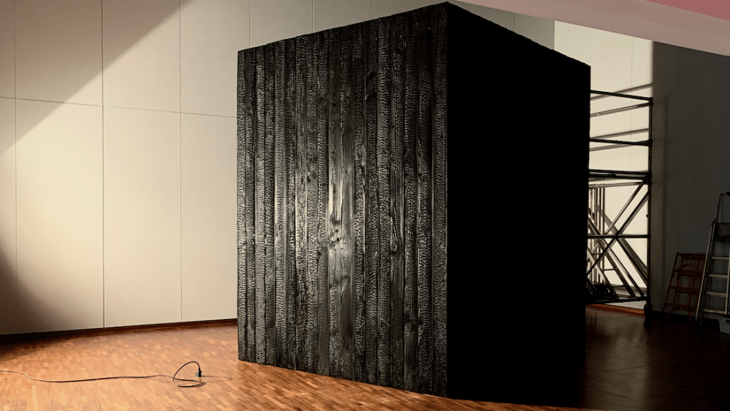 Un grand cube noir de bois brûlé – monolithe carbonisé – se dresse devant vous, planté dans le sol.